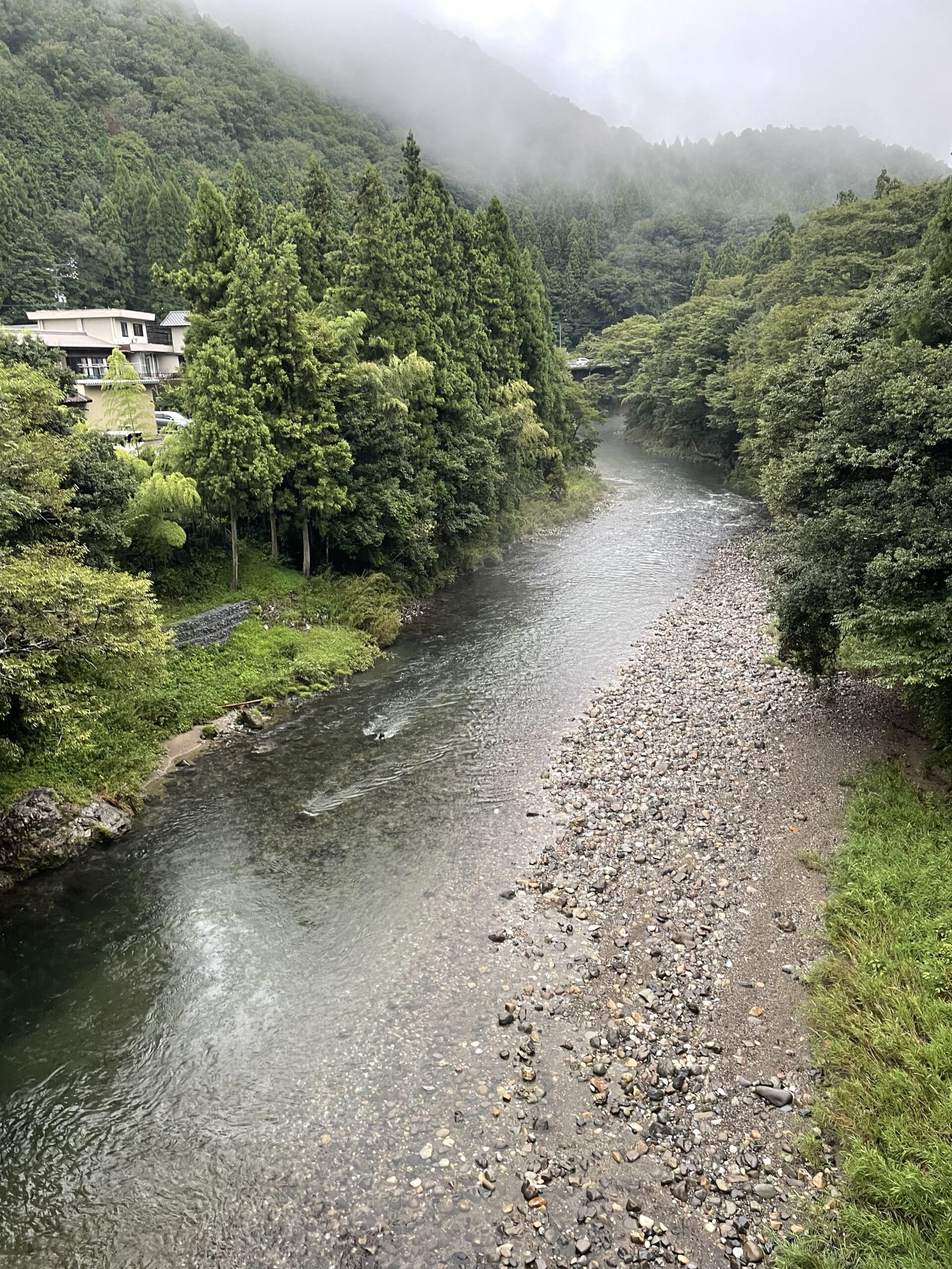 川の水位は平水です。濁りもありません。少し川霧りが出ています。天気は雨が降っています。