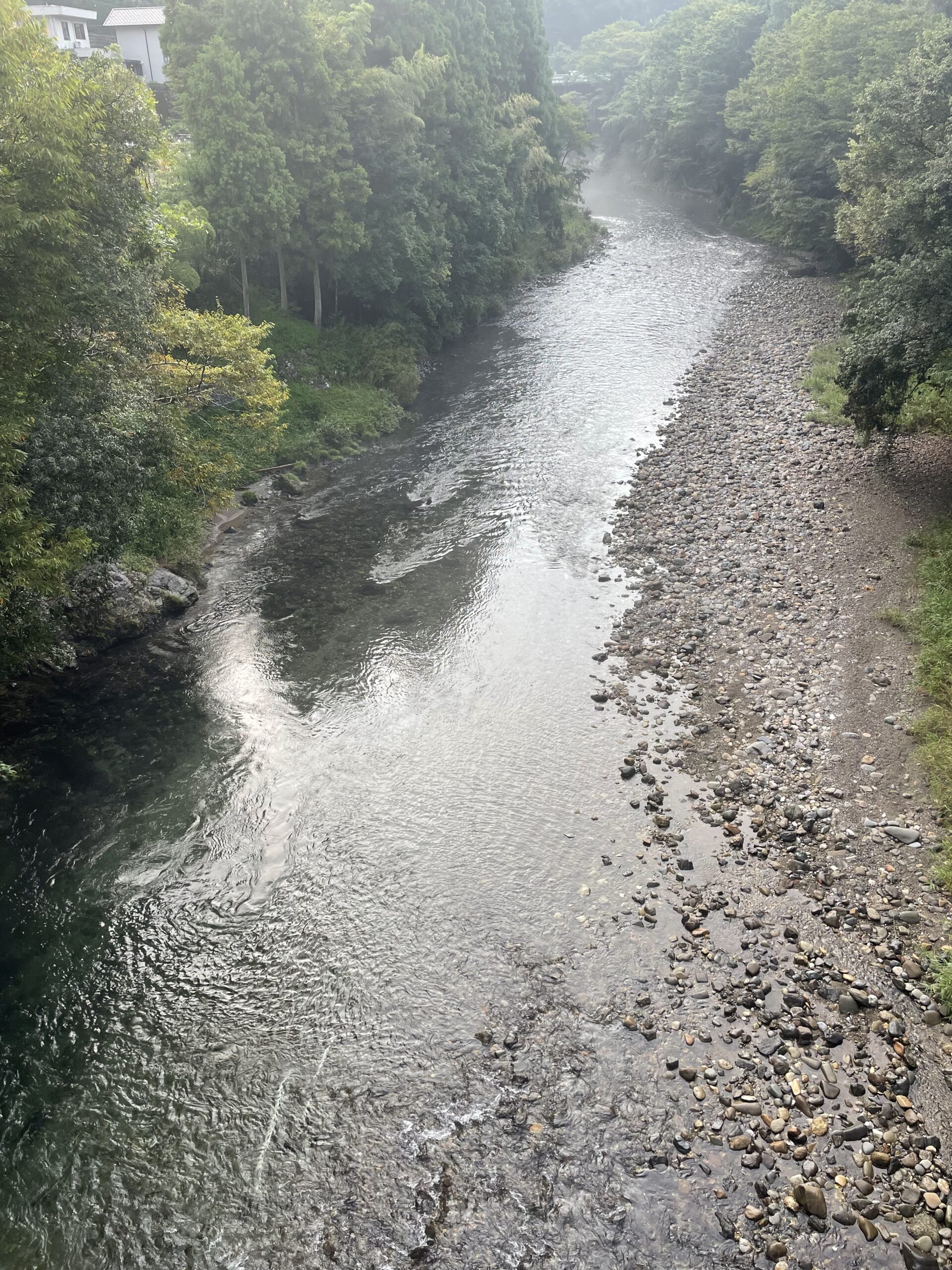 川の水位は、ほぼ平水です。濁りは少し昨夜の雨でぼやっとしています。釣りには影響はありません。川霧が少し出ています。