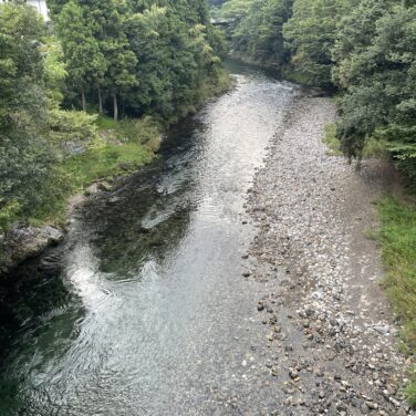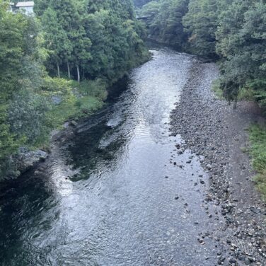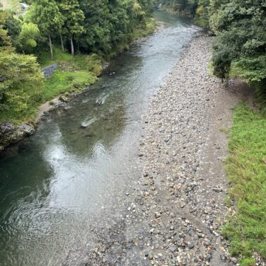 川の水位は30センチ前後冠水しています。1時間位前に激しい雨が降りました。川は少し濁っています。鮎釣りはできます。台風が心配です。