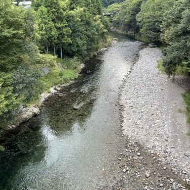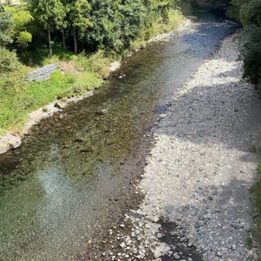 川の水は30センチ40センチ渇水しています。水はきれいです。天気は曇っています。少しパラパラしています。